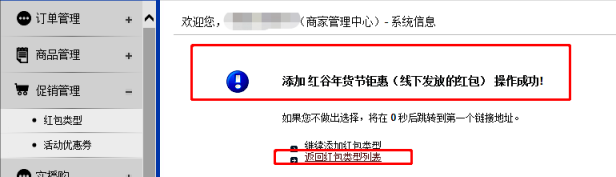 2. 提示添加成功,商家可从后台操作停用或移除设置的红包活动。